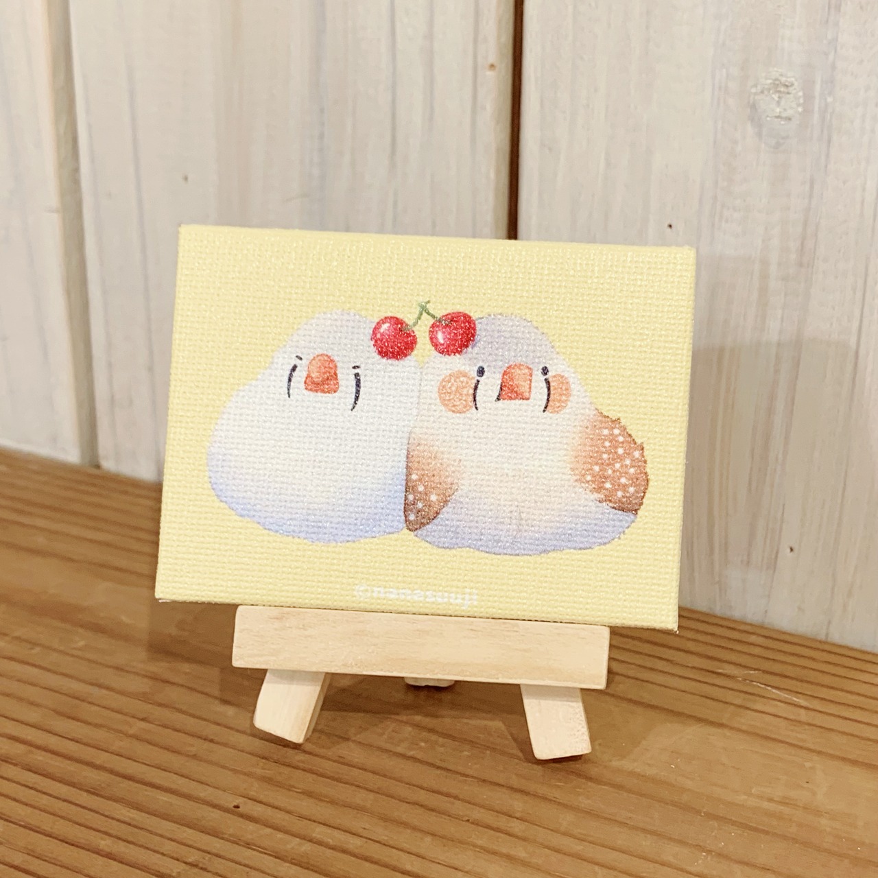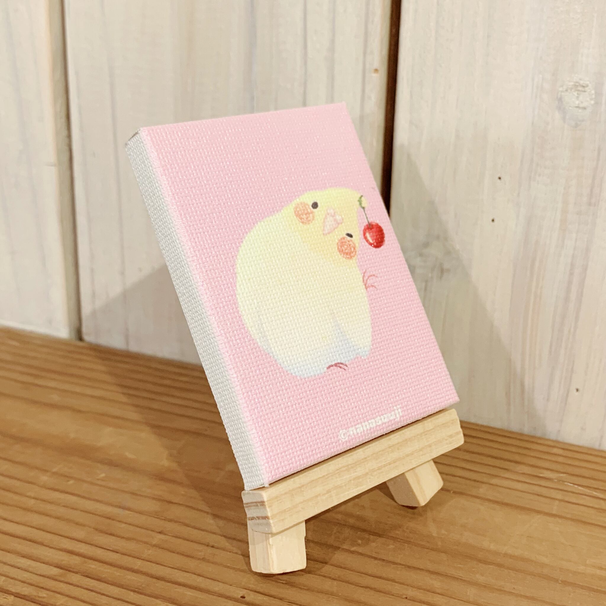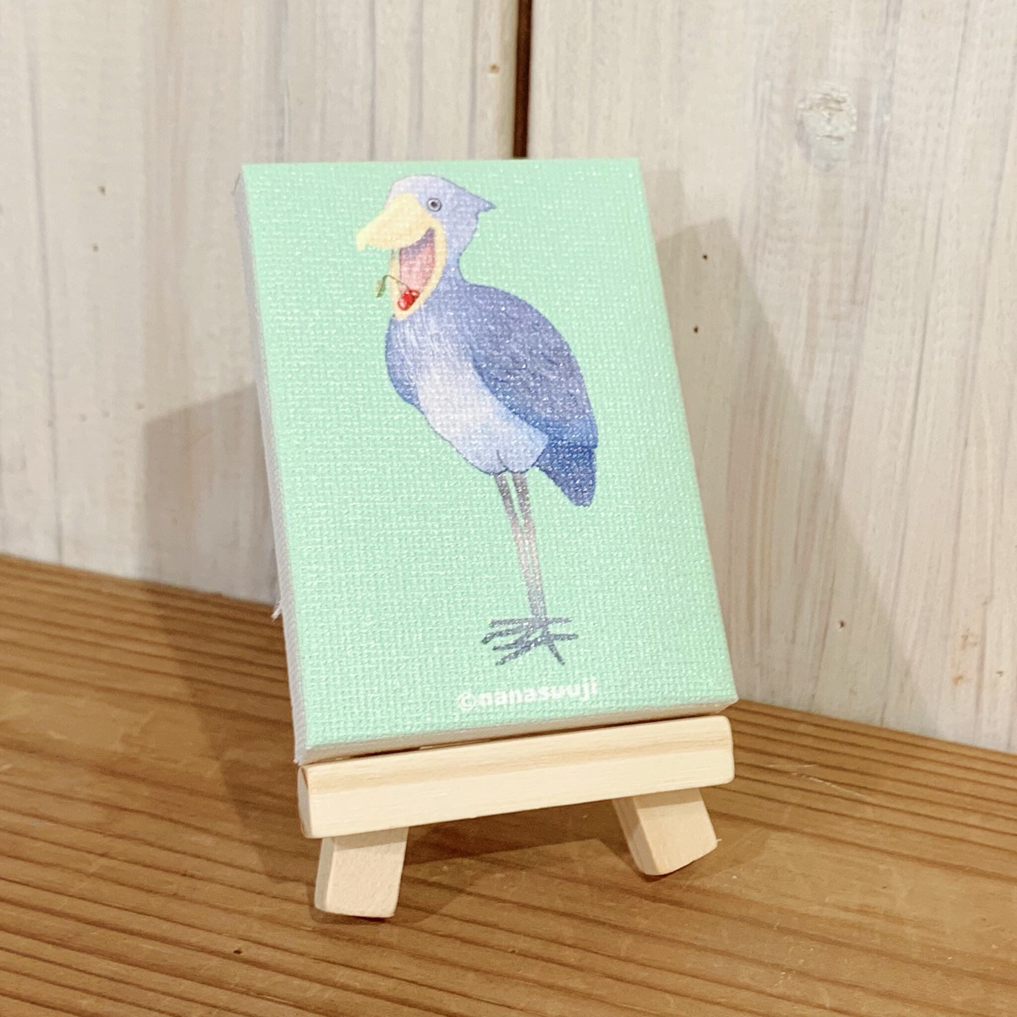 『食後のくちばし』展のDMの描き下ろしイラストのミニキャンバスです。